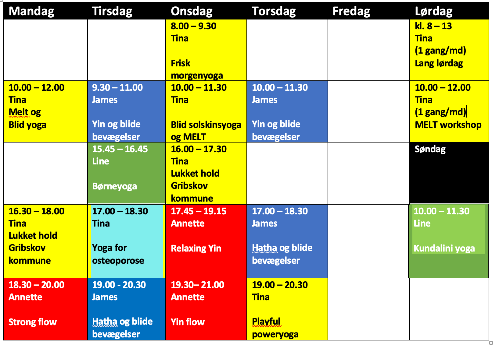 NEDENSTÅENDE SKEMA ER ET GENERELT SKEMA OVER YOGAKLASSER I YOGA HOUSE. MEN UNDERVISERNE HOLDER FRI PÅ FORSKELLIGE TIDSPUNKTER, SÅ FOR AT SE AKTUELLE KLASSE – GÅ TIL KALENDER